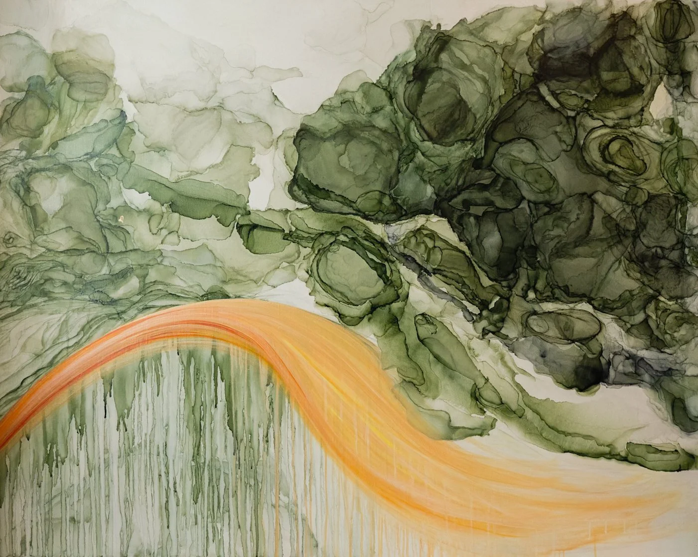 A gentle current of green and gold drifts across the canvas, as if nature itself were exhaling. Translucent veils unfurl like memories returning to light — soft, fluid, and alive. Beneath the golden arc, renewal whispers through the mist, suggesting the quiet persistence of life after stillness.
